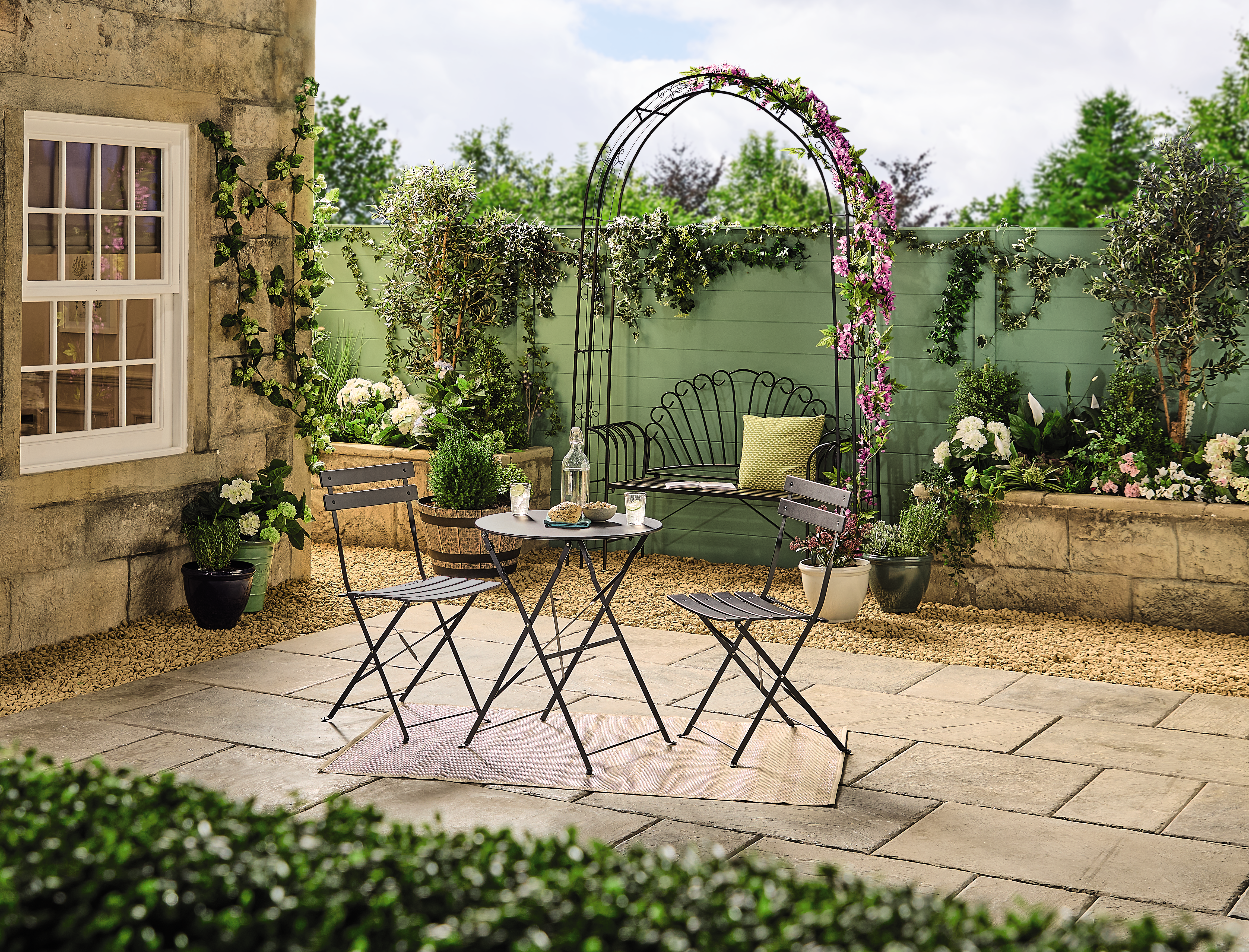 Perfect for a Parisian garden experience, why not pick up the Hampton Bistro Set for just £49.99. This sturdy yet stylish set will have guests dining al fresco in style and can be easily folded away when not in use. The set pairs perfectly with the Decorative Garden Arch (£29.99) – a garden necessity for bringing beautiful blooms to life. Crafted from powder-coated metal in matte black, the integrated ground spikes make this arch durable and easy to assemble.